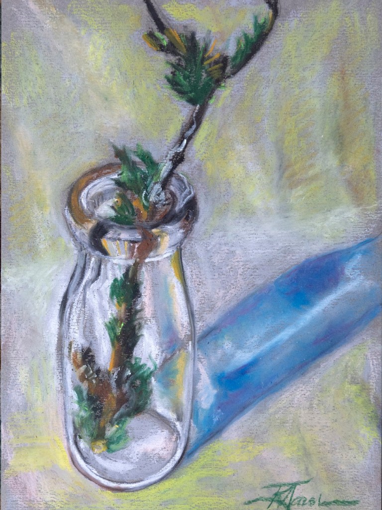 Oil pastels are a lot of fun. Old-school milk bottle with a dead lichen-covered twig from our ancient apple tree.