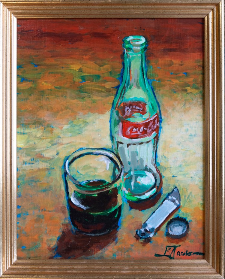 The best of my glass pictures from last summer. A coke in a juice glass that was almost gone. Also, Mexican Coca-Cola isn’t twist-top–you need an old-fashioned bottle opener to enjoy it. This painting was exhibited in the Edmonds Arts Festival in 2021, and is framed as shown.