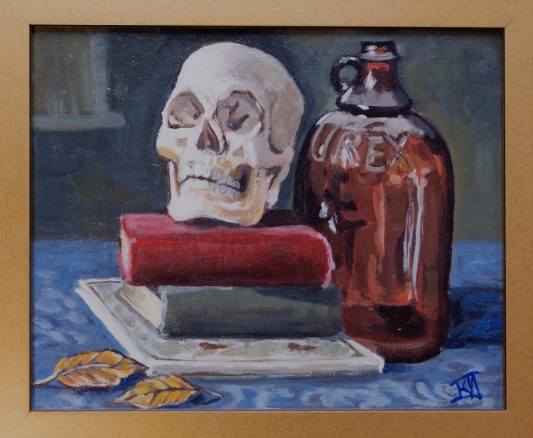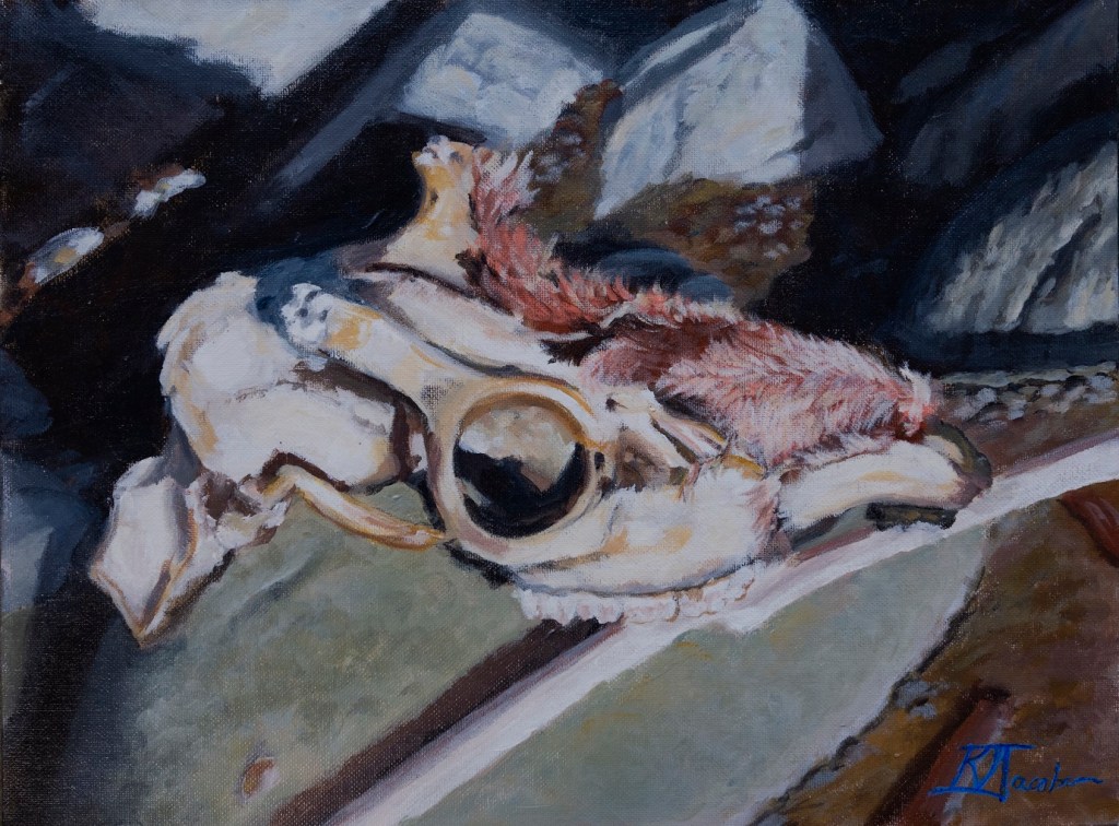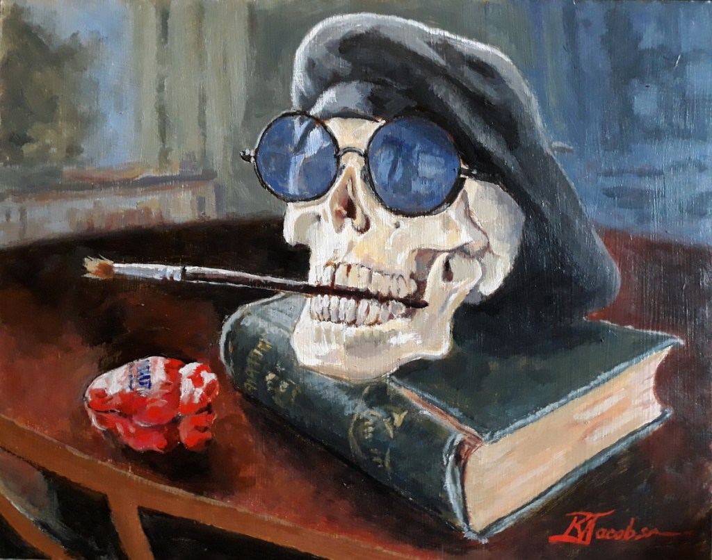 Recent piece inspired by found objects. I found a pair of steampunk-looking sunglasses in the road on a recent walk. I put them on Cal the Skull and he chomped one of my ruined brushes. Jake thought an artist beret would be cool, so I added my wool hat and a book that was a reject from the library sale (too torn up). The little squishy toy heart is a drug company giveaway.