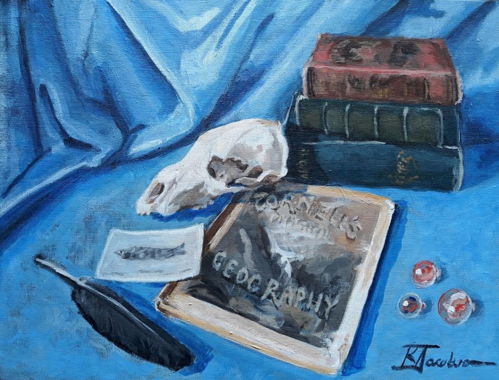 On an old blue tablecloth, objects of curioslty. I stacked some old books, a scrounged bear skull, an old postcard and a feather to sort of create an old sciency-naturalist vibe. Then some marbles snuck in. I haven’t lost all of them.